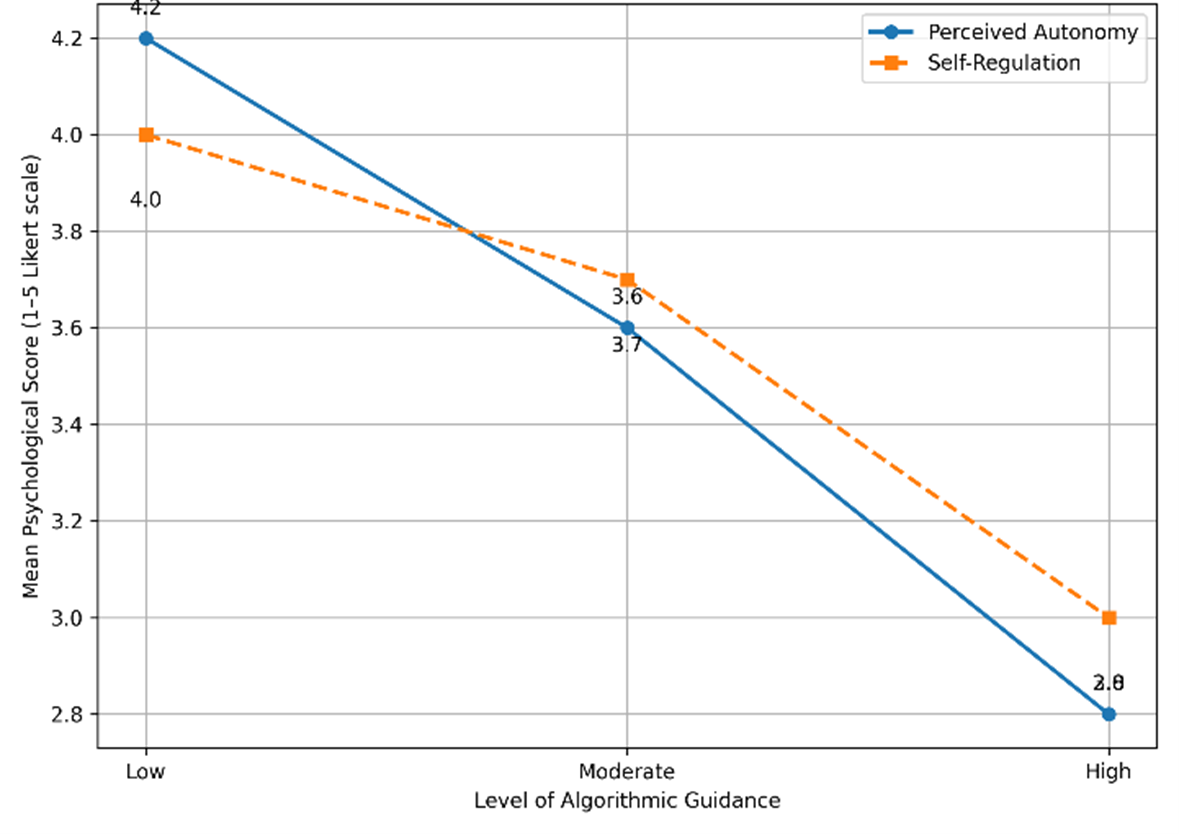 Psychological evidence suggests that moderate algorithmic guidance may represent an optimal balance. At this level, learners benefit from adaptive scaffolding while retaining meaningful control over pacing and learning strategies. Excessive guidance, however, is associated with a decline in perceived autonomy and increased reliance on external regulation, consistent with self-determination theory (Deci & Ryan, 2008; Ryan & Deci, 2000).