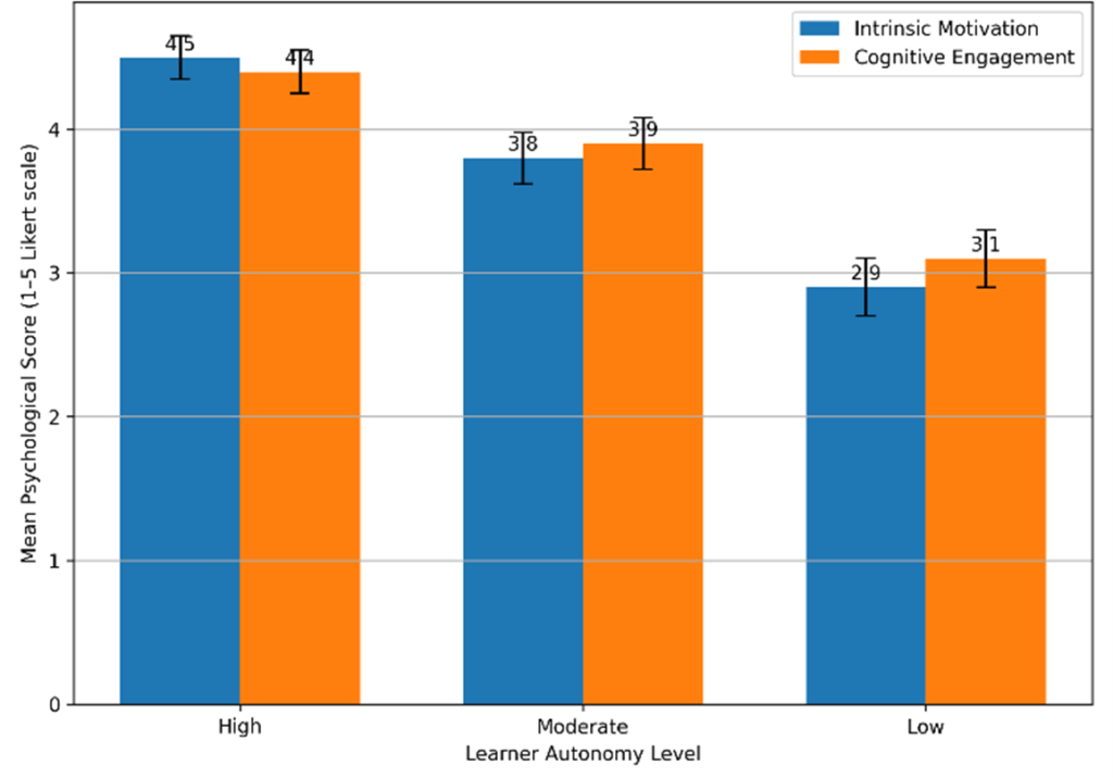 Figure 2 illustrates the association between perceived learner autonomy and intrinsic motivation in AI-mediated learning environments. Higher levels of autonomy correspond to stronger intrinsic motivation, while reduced autonomy is associated with motivational decline, consistent with self-determination theory (Deci & Ryan, 2008; Ryan & Deci, 2000).